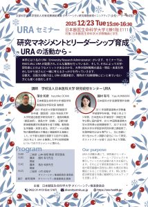 2025年12月23日(火)15:00~ URAセミナー「研究マネジメントとリーダシップ育成-URAの活動から-」を開催いたします。